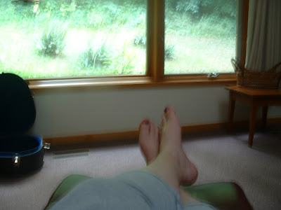 my feet in the spa/ jacuzzi room, very cool view of the woods